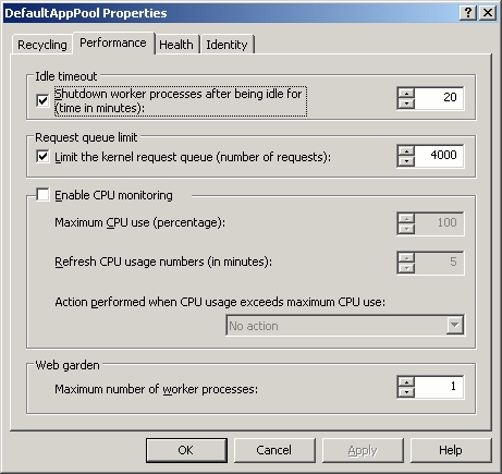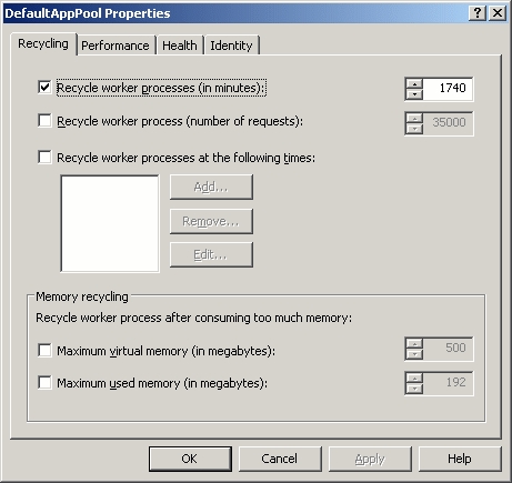 The first tab for the app pool properties displays information regarding memory resource usage. If you have multiple sites on a server which are hit very often and would like to force the amount of memory each one uses, you can create an app pool for each and manage it here.