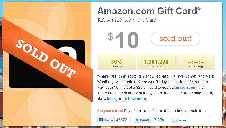 Yesterdays coupon on living social was a $20 gift card being sold for $10. Over 1.3 million gift cards were sold, as you can see in the image above. This equates to approximately $13 million gross for Amazon..